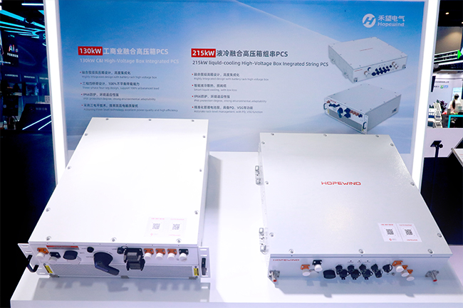 本次展會,禾望電氣帶來了10MW集中式一體機(jī)新品,采用液冷散熱方式,可達(dá)到51℃不降額,安全性高、適應(yīng)性強(qiáng)。全新的130kW工商業(yè)融合高壓箱PCS、215kW液冷組串式PCS,也吸引了業(yè)界的廣泛關(guān)注。其中,130kW風(fēng)冷PCS定位工商業(yè)應(yīng)用場景,采用三相四橋臂設(shè)計,具備100%不平衡帶載能力,能夠在各種復(fù)雜工況下保持穩(wěn)定輸出。而215kW液冷PCS則采用了高效的三電平設(shè)計、融合簇級高壓箱設(shè)計和智能液冷散熱設(shè)計,實(shí)現(xiàn)了低損耗和高效率的完美結(jié)合,顯著提升了產(chǎn)品的性能和可靠性。