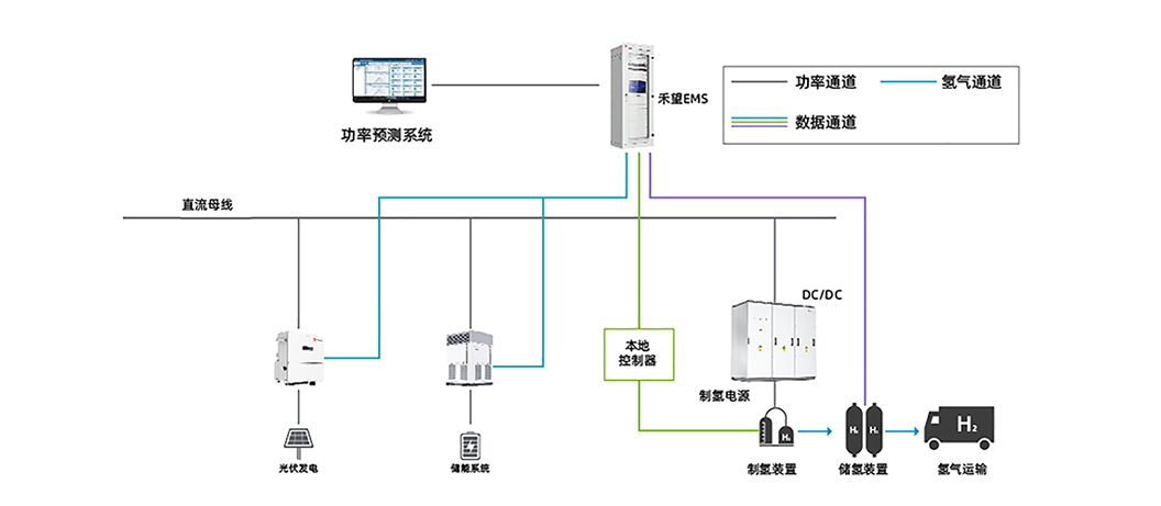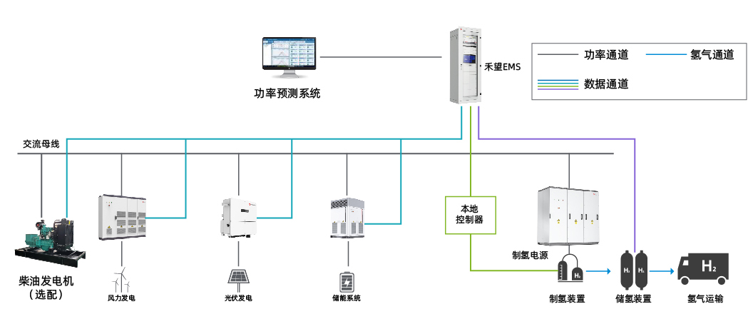 離網(wǎng)型制氫場景,制氫電力來自風(fēng)力發(fā)電/光伏發(fā)電/儲能系統(tǒng)等,該場景下由于缺乏大電網(wǎng)支撐,微電網(wǎng)波動較大,制氫電源需要在更寬的電壓波動及頻率波動范圍內(nèi)運行。采用禾望EMS進(jìn)行新能源發(fā)電、儲能、制氫的整體協(xié)調(diào)控制,可實現(xiàn)系統(tǒng)的高效響應(yīng)、有功無功的協(xié)調(diào)輸出、儲能系統(tǒng)的快速調(diào)節(jié)、平抑新能源發(fā)電波動等功能,并配有完善的保護(hù)機制和智慧運維管理系統(tǒng),保障系統(tǒng)安全、高效制氫。
